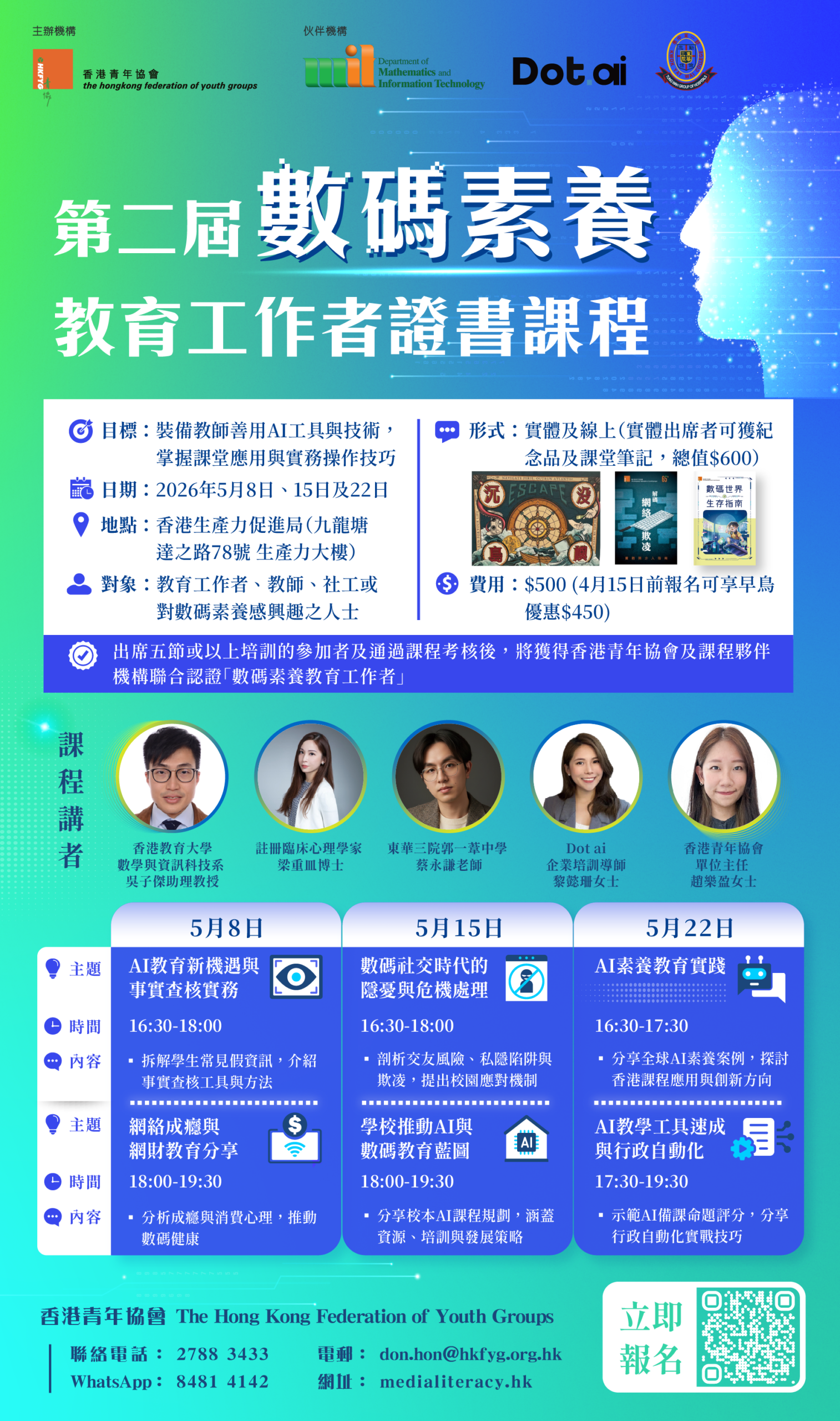 香港青年協會在過去十年致力推動數碼素養教育,希望協助教師及教育工作者應對人工智能等新興科技帶來的前線教育挑戰。本單位將在2026年5月舉辦第二屆「數碼素養教育工作者證書課程」