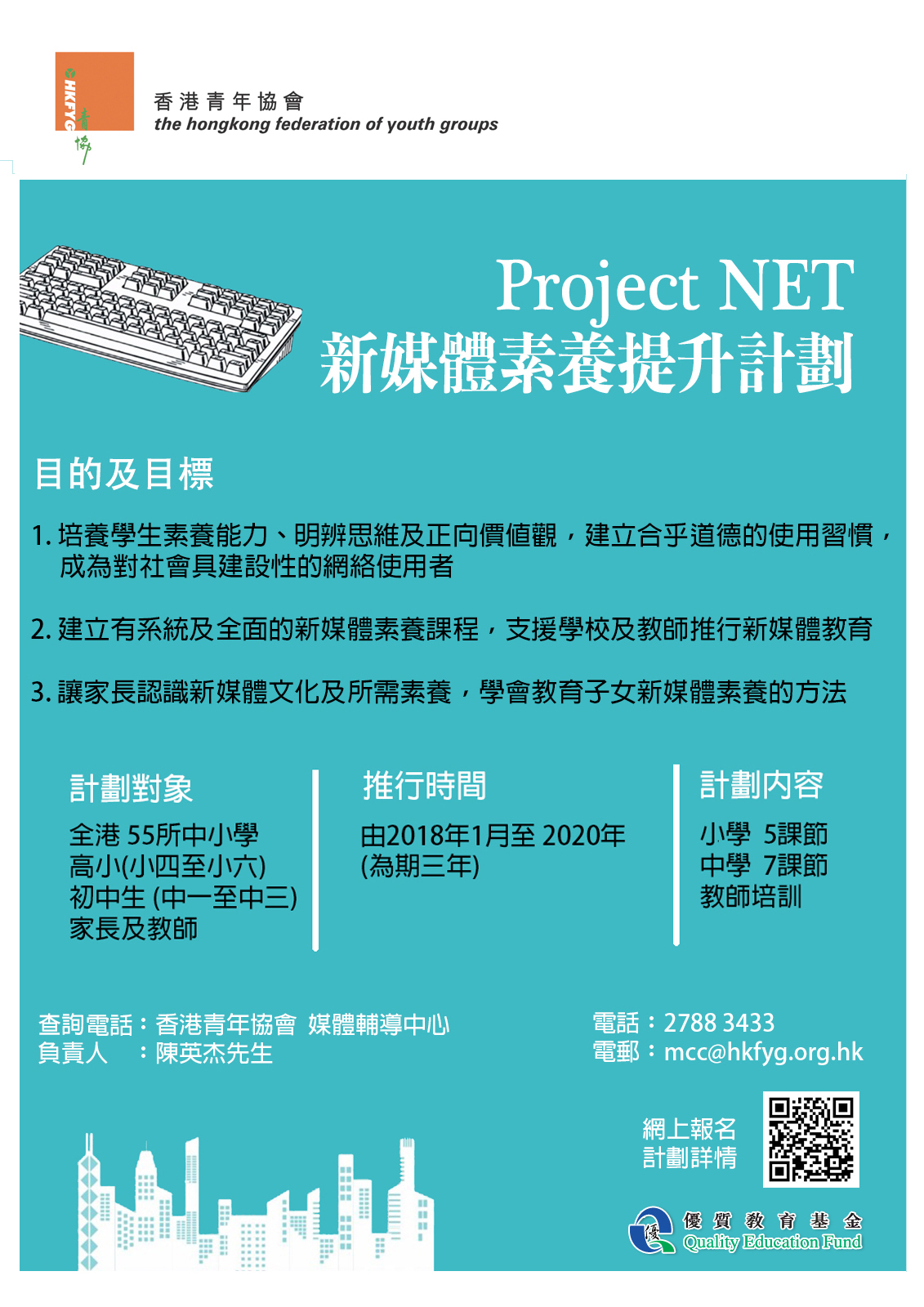 承蒙優質教育基金贊助,香港青年協會媒體輔導中心推出「Project Net」新媒體素養提升計劃,為期三年,旨在協助高小及初中學生建立使用新媒體的態度,提升批判思考、分析力、正確價值觀和責任感等,使他們面對新媒體訊息時懂得如何尋索、評估、使用及創造媒體資訊。同時,讓他們懂得評估資訊的影響力、學會網絡言行禮儀、保護私隱,成為具智慧的網絡使用者及資訊創造者。有關中學及小學課程計劃詳情,請參閱計劃內容。